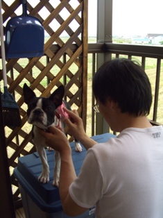 一匹はお風呂場で水遊びをして、自分で風呂の栓を抜いてバスタオルで拭いてくるおりこうなボステリ君。